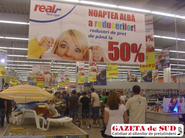 Sub sloganul „Noaptea Albă a Reducerilor“, cele aproximativ 40 de magazine care activează în Galeria real,- au practicat reduceri de până la 50% în noaptea de vineri spre sâmbătă, în intervalul orar 21.00-02.00. Majoritatea craiovenilor au ales magazinele de îmbrăcăminte şi încălţăminte şi, cei mai norocoşi dintre aceştia, au plecat acasă şi cu un premiu. Magazinul Plusoptic, situat la parterul galeriei, a avut reduceri de 20% la ochelarii de soare şi, în plus, a oferit două premii clienţilor, constând în ochelari de soare la alegere. „Am venit în urmă cu două zile să-mi cumpăr ochelari de soare şi am aflat că va avea loc noaptea reducerilor. Am revenit acum şi se pare că am avut noroc de două ori. O dată că mi-am luat ochelarii doriţi cu 20% reducere şi, în plus, am câştigat altă pereche de ochelari de soare, la alegere“, a precizat Doina Mazilu, una dintre câştigătoare.