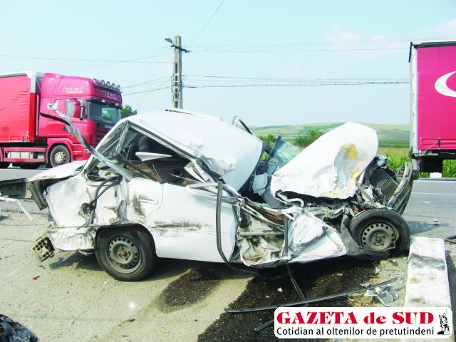 Un tir cu numărul de înmatriculare MM-20-EXT aducea ieri profiluri PVC de geam termopan de la firma Extruplast din Baia Mare către societatea Feroplast din Craiova. În jurul orei 13.00, autotrenul a intrat în comuna Brădeşti. Mai avea doar câţiva kilometri până la destinaţie, când şoferul tirului – maramureşeanul Joseph Attila Moni – a pierdut controlul volanului. Autocamionul greu s-a dus de-a dreptul către un Cielo alb, cu numărul DJ-06-KIH, oprit pe partea dreaptă a drumului.