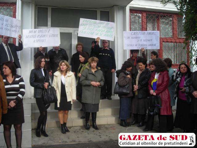 Aproximativ 30 de dascăli, profesori titulari la Şcoala nr. 24 din Craiova, au protestat ieri în faţa unităţii de învăţământ, în semn de solidaritate cu învăţătoarea Cristina Anghel, din Caracal – Olt, care se află de două luni în greva foamei şi care vrea să continue protestul până când se va soluţiona cererea sa de aplicare a legii care majorează salariile profesorilor cu 50%.