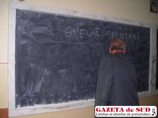 Profesorii de la Grupul Şcolar „George Bibescu“ din Craiova şi-au întrerupt ieri activitatea între orele 12.00-16.00, după ce reprezentanţii unităţii de învăţământ au primit ordin de la primărie să reţină dascălilor 25% din banii pe care aceştia i-au primit pentru perioada concediului. Deşi confederaţiile sindicale din ţară au făcut apel ca toţi profesorii să-şi întrerupă activitatea timp de patru ore – în timpul şedinţei de guvern -, doar dascălii din această unitate de învăţământ doljeană s-au conformat şi au refuzat să predea. „Este inadmisibil ca în noiembrie şi decembrie să ni se reţină 25% pentru indemnizaţia de concediu pe luna iulie, 25% pentru luna august şi alţi 25% banii reţinuţi de guvern ca reducere salarială aplicată tuturor bugetarilor. Un dascăl debutant va pleca acasă cu 150 de lei în cazul în care reducerile amintite se vor aplica. Tocmai de aceea, profesorii din unitatea noastră de învăţământ au hotărât să înceteze activitatea timp de patru ore, alegând ca formă de protest «greva spontană». Au semnat însă în condică şi au intrat la ore să supravegheze elevii, nu să predea“, a precizat profesorul Florea Toma, lider de sindicat în Grupul Şcolar „George Bibescu“.
