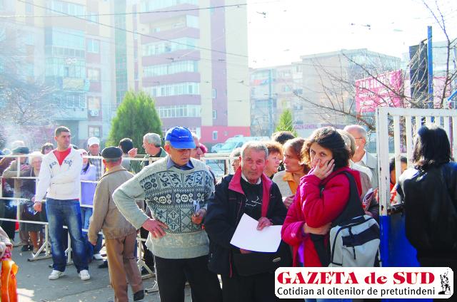 Cu fiecare minut se adaugă două, trei persoane la rândul format la poarta Depoului de Tramvaie din cartierul Craioviţa Nouă, singurul punct de distribuire. Cei care sunt neputincioşi şi-au trimis rudele şi tot nu au renunţat la aceste gratuităţi.
