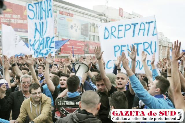 Atmosferă ca în vremurile bune ale Universităţii Craiova, însă, din păcate, de data aceasta, scandările şi încurajările frenetice ale suporterilor olteni nu s-au făcut auzite pe legendara arenă „Ion Oblemenco“, ci în Piaţa „Mihai Viteazul“. Privaţi de fotbal de aproape un an, peste o mie de ultraşi nu s-au resemnat şi, cu mic, cu mare, au participat la mitingul privind dezafilierea Universităţii Craiova, intitulat „Ştiinţa nu moare“. S-au afişat numeroase bannere, cum ar fi: „Dreptate pentru Ştiinţa“, „Noi ne păstrăm credinţa în inimă pentru Ştiinţa“ sau „Ne e dor şi doare, fără noi fotbalul nu are culoare“. Pătimaşii suporteri ai Ştiinţei au aprins torţe şi fumigene, pe care le-au „acompaniat“ cu celebrele cântece „Oltenia, Eterna Terra Nova“ şi „Cântec pentru Oltenia“, mulţumindu-le totodată jandarmilor craioveni că nu au procedat la fel ca omologii lor din Bucureşti, la mitingul de pe 24 martie.