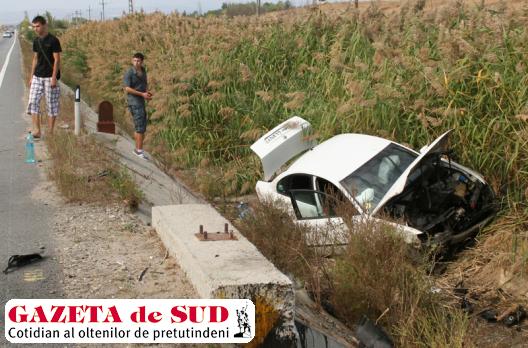 O şoferiţă, de 24 de ani, din Drobeta Turnu Severin, a scăpat ca prin minune fără nici o zgârietură după ce maşina pe care o conducea a lovit un cap de pod, s-a dat de mai multe ori peste cap, aterizând în canalul de scurgere a apei pluviale de pe DE 70, în dreptul localităţii Şimian. Accidentul s-a produs cel mai probabil din cauza vitezei. Tânăra a fost preluată de medici, dar nu a avut nevoie de internare.
