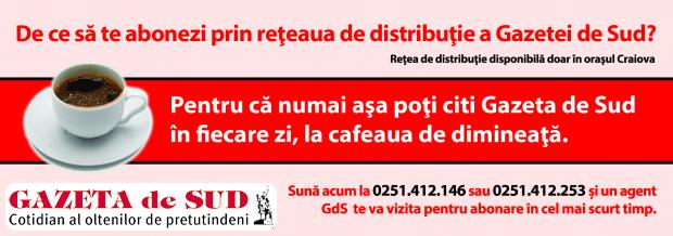Ziarul va ajunge la dumneavoastră până în ora 6.30, când veţi putea afla cele mai noi ştiri din Oltenia – şi nu numai – la cafea, dis-de-dimineaţă. În plus, veţi avea acces gratuit şi nelimitat la www.gds.ro, ediţia on-line a Gazetei de Sud, inclusiv la mica publicitate din mediul virtual al ziarului nostru. Totodată, puteţi da gratuit, în ediţia tipărită, anunţuri în valoare de cinci lei în fiecare lună, sumă ce se reportează dacă nu este folosită la acel moment.