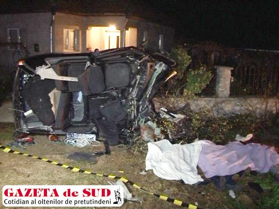 Un grav accident rutier soldat cu patru morţi şi un rănit a avut loc în noaptea de joi spre vineri, în comuna gorjeană Drăguţeşti, în apropiere de municipiul Târgu Jiu. Conducătorul auto, I.V., un tânăr de 21 de ani, din Târgu Jiu, a fost, de asemenea, grav rănit, fiind în situaţia de a-i fi amputate picioarele. Cei cinci tineri se întorceau de la Rovinari, de la o petrecere de Sfinţii Mihail şi Gavriil. Potrivit poliţiei, din cauza vitezei, într-o curbă deosebit de periculoasă, şoferul a pierdut controlul volanului. Maşina a ieşit de pe carosabil, s-a răsturnat şi s-a izbit cu putere de un cap de pod, la câţiva metri de o gospodărie. Patru dintre pasageri au murit pe loc, în ciuda faptului că la faţa locului au fost trimise mai multe ambulanţe în încercarea de a-i resuscita pe tinerii prinşi între fiarele contorsionate ale maşinii. Cei care nu au avut nici o şansă în urma impactului violent între autoturismul condus cu viteză şi capul de pod sunt: R.V., de 29 de ani, S.P., de 29 de ani, D.M., de 22 de ani, şi Maria Tuncu, de 18 ani, din Tismana.