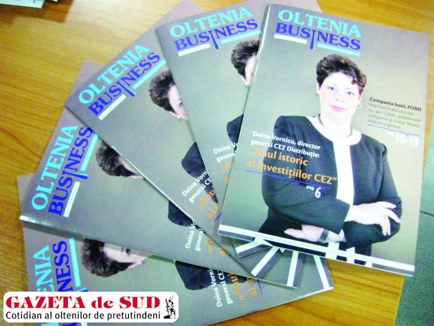 În cadrul aceluiaşi eveniment de miercuri va fi lansată revista Oltenia Business. Realizată în colaborare cu CCI Dolj şi Gazeta de Sud, revista de afaceri se lansează sub sloganul „Pentru afaceri premium“ şi are o ţintă exclusivistă: managerii celor mai importante companii din judeţ. În primul număr al revistei puteţi cunoaşte poveştile de succes ale unora dintre antreprenorii care au un cuvânt greu de spus în businessul local şi chiar naţional, interviuri în exclusivitate, advertoriale, analize economice, reportaje şi altele. Oltenia Business va fi distribuită, în cadrul Galei Topul Firmelor, ambasadelor, ministerelor, autorităţilor publice din Oltenia, dar şi altor parteneri ai CCI Dolj.