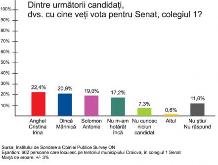 Craiovenii din Colegiul 1 Senat au păreri împărțite când vine vorba de opțiunile de vot pentru mandatul pus la bătaie în acest colegiu. 22,4% dintre craiovenii din Colegiul 1 Senat ar vota candidatul USL, Cristiana Irina Anghel, în timp ce 20,9% susțin că ar vota cu Mărinică Dincă, candidatul Alianței România Dreaptă în acest colegiu. Fostul primar al Craiovei, Antonie Solomon, ar obține doar 19% dintre voturile craiovenilor din Colegiul 1 care se vor prezenta la urne. Un număr important dintre cei chestionați, peste 17%, susține că nu s-a decis încă în dreptul cărui candidat va pune ștampila, în timp ce alte 7,3 procente au declarat că nu cunosc nici un candidat din colegiul lor. 11,6% dintre cei chestionați au spus că nu știu sau nu vor să răspundă la întrebarea adresată de operatorii Institutului de Sondare a Opiniei Publice Survey ON din Brașov.