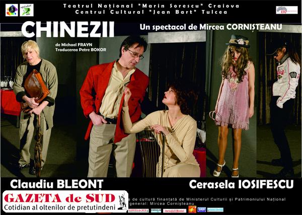 Spectacolul „Chinezii”, de Michael Frayn, în regia lui Mircea Cornișteanu va fi reluat la Teatrul Naţional din Craiova pe 16, respectiv 17 februarie, într-o nouă distribuție. Astfel, rolul interpretat până în prezent de actorul George Alexandru va fi preluat de Claudiu Bleonț, care va juca alături de Cerasela Iosifescu într-o comedie spumoasă, antrenantă, cu răsturnări neprevăzute de situație. Cele două reprezentații ale spectacolului (realizat în parteneriat cu Centrul Cultural Jean Bart, Tulcea) vor avea loc la sala Ion D Sîrbu a Teatrului Naţional din Craiova.