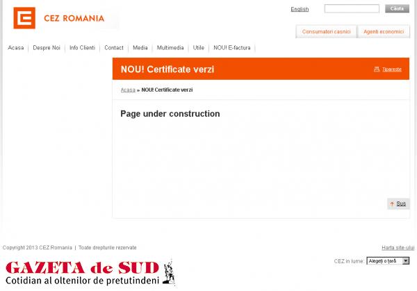 În urma scandalului declanşat de metodologia de calcul pentru preţul unitar al Certificatelor Verzi (CV), compania CEZ şi-a suspendat pagina de internet care detalia aceste informaţii. La secţiunea „NOU! Certificate verzi” de pe prima pagină apare acum menţiunea „Page under construction” (foto). Clienţii CEZ care primesc în această perioadă facturile la energie electrică sunt privaţi astfel de informaţii esenţiale privind calculul certificatelor verzi pe care trebuie să le plătească. Precizăm că metodologia de calcul a CV este detaliată şi poate fi consultată pe site-ul GdS, în articolul „CEZ şi-a păcălit clienţii cu milioane de euro”. Tot aici cei interesaţi pot găsi şi precizările Agenţiei Naţionale de Reglementare în domeniul Energiei (ANRE) în legătură cu metodologia de calcul a certificatelor verzi.