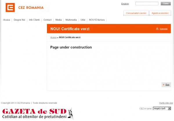 În urma scandalului declanşat de metodologia de calcul pentru preţul unitar al Certificatelor Verzi (CV), compania CEZ şi-a suspendat pagina de internet care detalia aceste informaţii. La secţiunea „NOU! Certificate verzi“ de pe prima pagină apare acum menţiunea „Page under construction“ („Pagină în construcţie“). Clienţii CEZ care primesc în această perioadă facturile la energie electrică sunt privaţi astfel de informaţii esenţiale privind calculul certificatelor verzi pe care trebuie să le plătească. Pentru cei interesaţi, metodologia de calcul a certificatelor verzi este explicată în două articole publicate recent de GdS: „Facturile CEZ, nerecomandate cardiacilor“ – miercuri, 20 februarie 2013 şi „CEZ şi-a păcălit clienţii cu milioane de euro“ – joi, 28 februarie 2013. De altfel, clienţii CEZ pot verifica metodologia de calcul în informările pe care CEZ le-a expediat o dată cu primele facturi ce conţin componenta certificate verzi. Scandalul certificatelor verzi a pornit de la sesizările unor cititori ai GdS, care au observat că valoarea unitară a CV pentru anul 2012, calculată conform legislaţiei în vigoare, nu corespunde cu cea din facturi. Ulterior, GdS a cerut companiei CEZ lămuriri în legătură cu aceste aspecte. În răspunsul trimis redacţiei prin e-mail, ni s-a dat un link către o secţiune de pe pagina de internet a CEZ, care conţinea informaţiile referitoare la certificatele verzi. Această secţiune este cea suspendată ieri de compania CEZ, nemaiputând fi consultată de clienţi. Cei care au apucat să consulte metodologia de calcul au început deja să sesizeze instituţiile statului. Reprezentanţii Comisariatului Regional pentru Protecţia Consumatorilor (CRPC) Oltenia au precizat ieri că au demarat cercetările cu privire la acest caz. „În acest moment, analizăm legislaţia în domeniu pentru a vedea cum au fost făcute calculele respective. Am sunat la colegii mei din celelalte judeţe şi am înţeles că, la nivel de regiune, s-au primit deja câteva sesizări în legătură cu aspectele semnalate“, a declarat Alida Mitruţoiu, comisar şef al CRPC Oltenia.