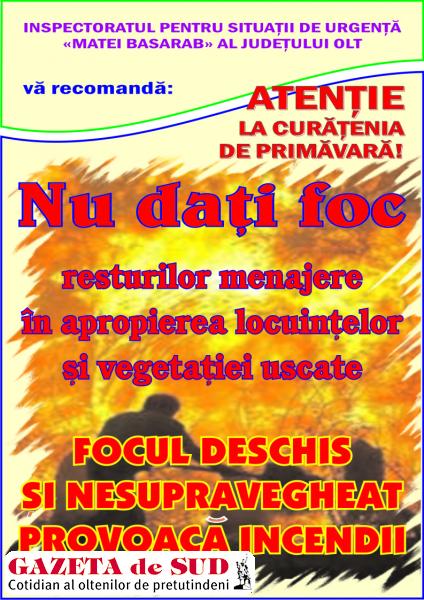 Trebuie menționat faptul că Inspectoratul pentru Situaţii de Urgenţă „Matei Basarab” al judeţului Olt a cerut tuturor primăriilor din județ să desfășoare în următoare perioadă acțiuni de informare a concetățenilor despre regulile privind utilizarea focului deschis şi de sancţionare a celor care practica arderile necontrolate. În parteneriat cu Garda de Mediu Olt se vor desfășura activităţi comune de identificare şi sancționare a persoanelor care practica incendierea necontrolată a terenurilor agricole ori virane.