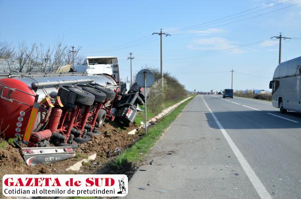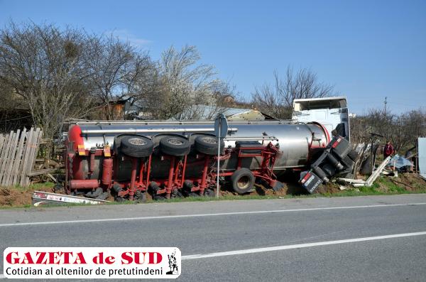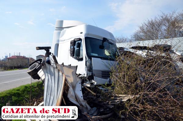 Un tir inmatriculat in Polonia a intrat sâmbătă după amiază într-o gospodărie de pe Centura de Nord a municipiului Craiova, după ce șoferul a încercat să evite un autoturism. Potrivit reprezentanților Inspectoratului de Poliție Județean (IPJ) Dolj, șoferul tirului a tras stânga de volan pentru a evita un autoturism al cărui șofer a plecat de pe loc fără să se asigure, a intrat pe contrasens, după care a ieșit de pe șosea și a trecut prin gardul unei gospodării. În urma producerii accidentului, nici o persoană nu a fost rănită, însă tirul s-a răsturnat, iar gardul și o magazie din gospodăria în care a intrat autotrenul au fost distruse.