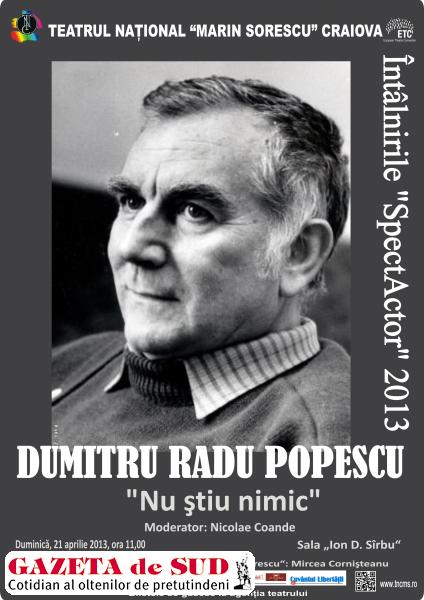 Scriitorul Dumitru Radu Popescu este invitatul lunii aprilie al Întâlnirilor „SpectActor”, manifestare iniţiată în anul 2009 de Teatrul Naţional din Craiova. Dumitru Radu Popescu, membru al Uniunii Scriitorilor din România şi academician, va susţine duminică, 21 aprilie, o conferinţă intitulată „Nu ştiu nimic”. Evenimentul va avea loc în sala „Ion D. Sîrbu” a Teatrului Naţional „Marin Sorescu” din Craiova, începând cu ora 11:00