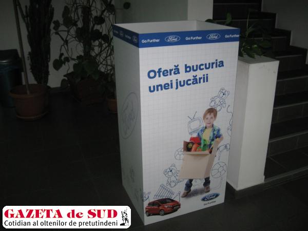 De astăzi şi până vineri, la sediul Gazetei de Sud, de pe strada Câmpia Islaz nr. 97A, se află amplasată o urnă în care puteţi dona jucării pentru copiii nevoiaşi. Urna a fost amplasată de către reprezentanţii Ford Craiova, care au cerut sprijinul nostru pentru a aduce bucurie pe chipurile unor copii ale căror familii au posibilităţi materiale limitate. Jucăriile vor fi donate de către reprezentanţii Fundaţiei Gazeta de Sud şi Ford Craiova familiilor sărace cu mulţi copii. Acţiunea se va desfăşura în jurul datei de 1 iunie – de Ziua Copilului.