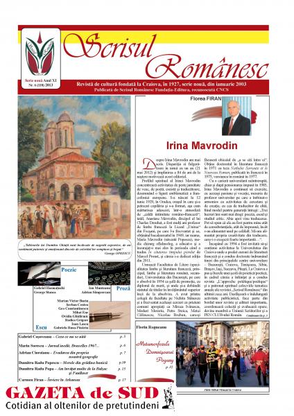 Numărul şase, pe iunie, al revistei de cultură Scrisul Românesc dedică aproape patru pagini profilului spiritual al regretatei Irina Mavrodin, poetă, eseistă şi traducătoare care, dacă timpul ar fi avut răbdare, ar fi împlinit 84 de ani pe 12 iunie, „dosar“ inedit (de fapt, editorialul acestui număr şase), redactat cu o rigoare ştiinţifică deosebită, şi care este realizat de prof.univ. dr. Florea Firan, directorul revistei Scrisul Românesc. Gabriel Coşoveanu completează editorialul revistei cu un comentariu la o carte-eveniment, „Autoscopii, autoficţiuni sau Câmpul cu maci“, a Irinei Mavrodin, o apariţie postumă, în 2013, publicată la „dragostea“ instituţionalizată din ultimii ani, şi anume Scrisul Românesc, Fundaţia-Editura, acolo unde i s-au publicat şase cărţi. Eseurile din acest număr sunt semnate de Marian Victor Buciu, Şerban Centea, Adrian Cioroianu, Geo Constantinescu, Mihai Ene, Ovidiu Ghidirmic, Rodica Grigore, Ioan Lascu, Gabriela Rusu-Păsărin, Ion Predescu, Georgiana-Elena Dilă.