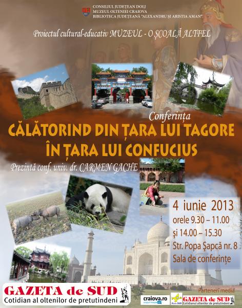 În data de 4 iunie, între orele 9.30 – 11.00 şi 14.00 – 15.30, la sediul Secţiei de Ştiinţele Naturii a Muzeului Olteniei se vor derula două conferinţe reunite sub genericul „Călătorind din ţara lui Tagore în ţara lui Confucius”. Evenimentul, organizat de Muzeul Olteniei, în colaborare cu Biblioteca Judeţeană “Alexandru şi Aristia Aman”, face parte din proiectul cultural educativ „Muzeul – o Şcoală Altfel„ şi este sprijinit finaciar de Consiliul Judeţean Dolj.