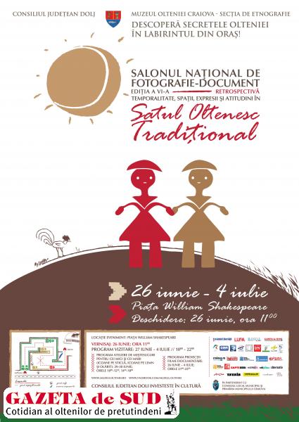 Piaţa „William Shakespeare” din Craiova găzduieşte, începând de mâine şi până joi, 4 iulie, cea de -a VI-a ediţie a Salonului Naţional de Fotografie-Document intitulată „Temporalitate, spaţii, expresii şi atitudini în satul oltenesc tradiţional”. Povestea satului oltenesc tradiţional va fi prezentată prin intermediul a o sută de imagini, într-un labirint expoziţional ce se va regăsi în centrul oraşului.