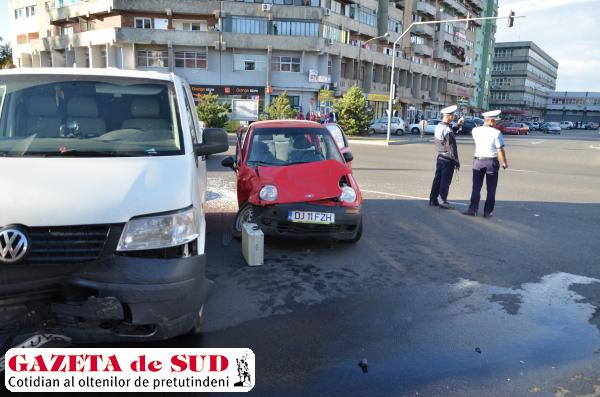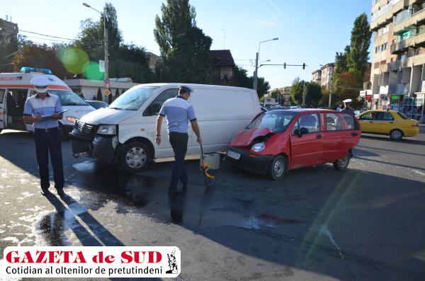 Trei femei au fost transportate la spital cu Ambulanţa în urma unui accident rutier produs în această seară la intersecţia Bulevardului Dacia cu Bulevardul Carol, în apropierea Gării Craiova. Din primele cercetări efectuate de poliţiştii de la Rutieră s-a stabilit că Anca Lupu, de 34 de ani, din comuna doljeană Unirea, care conducea un autoturism Matiz, încercând să vireze stânga spre Bulevardul Carol, nu a acordat prioritate de dreapta unei autoutilitare Volkswagen Transporter. Matizul a fost lovit de dubiţă, în urma impactului rezultând rănirea celor trei femei aflate în Matiz, care au fost duse la spital pentru investigaţii.