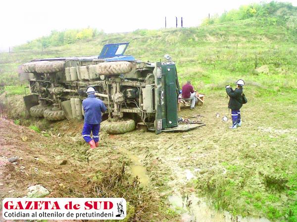 Un grav accident de muncă s-a produs ieri-dimineaţă la Cariera Roşiuţa, din cadrul Complexului Energetic Oltenia. Un autovehicul care transporta 12 mineri şi ingineri a rămas blocat pe o pantă şi s-a răsturnat într-un şanţ, în apropierea haldei Ştiucani. Conducătorul auto, de 47 de ani, era angajatul unei firme prestatoare de servicii din Drobeta Turnu-Severin. Utilajul transporta salariaţii carierei între punctele de lucru. Autoturismul, o autoutilitară mixtă pentru transport marfă şi persoane, nu a mai putut fi controlat în momentul în care a rămas blocat pe o pantă, s-a înclinat şi s-a răsturnat pe o parte. Sub maşină au fost prinşi pasagerii, însă zona din faţă a autovehicului a fost grav avariată, şoferul fiind practic zdrobit între fiarele care s-au îndoit sub presiunea uriaşă a greutăţii maşinii. Conducătorul auto a murit pe loc, neavând nici o şansă de supravieţuire. Un pasager a rămas, de asemenea, blocat între fiarele îndoite, fiind rănit grav.