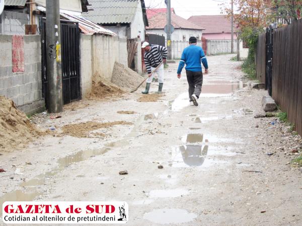 Situaţia nu diferă prea mult nici în cartierul Romaneşti. Câteva femei încearcă să traverseze o baltă imensă pentru a ajunge la noi, pe strada Ecoului, unde se strânge apa de pe celelalte străzi. „Eu am în curte apă! Vine salvarea, doctoriţa nu se dă jos pentru că nu are cum. Au venit din ăştia ca militarii să ne tragă apa, au zis că vin doar pe strada principală… Să ne facă şi nouă canalizare! Sunt bătrână, nu vine salvarea!“, repetă Sevastiţa Enăchiţă, supărată pe autorităţi. „De 60 de ani suntem în cartierul ăsta, din 1956, şi nu s-a făcut nimic, nici măcar un magazin nu avem. Canalizare vrem!“, o completează o vecină de după intersecţie. „Nu sunt numai ţigani aici, mai sunt şi români! Cu câte vidanje au adus aici făceau de zece ori canalizare. Prea e bătaie de joc, nu ne ajută nimeni cu nimic“, se completează femeile una pe alta. A treia doamnă trece strada: „Cred că înotam ca broaştele dacă nu ne făceau aici un trotuar!“, exclamă femeia cu un batic pe cap, în timp ce merge pâş-pâş pe trotuarul micuţ. Ploaia începe să se liniştească spre prânz. Lumea se retrage în case, acolo unde apa nu le-a ajuns. Încă.