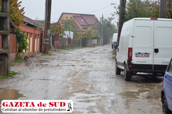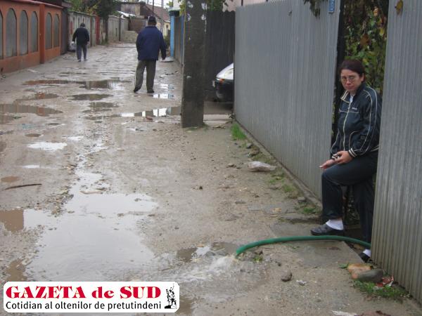 Ploaia continuă. Altă femeie, mai în vârstă, trece prin zonă cu o plasă în mână. „Apa de ploaie, apa care bălteşte la fiecare ploaie! Au venit cei de la Compania de Apă, rezolvarea lor este ca la fiecare ploaie trimit maşinile. O soluţie pe termen lung ar fi să bage nişte ţevi, am suporta noi costurile, dar nu se face! Motivează dânşii că strada nu are cădere liberă şi le trebuie pompă sau nu ştiu ce alte maşinării, ceea ce eu nu cred. Soţul e înscris în audienţe, nu îl primeşte doamna primar, îl expediază la domnul Nedelescu. El vorbeşte numai în scris, am acasă o grămadă de răspunsuri acasă că nu sunt bani; studiul este aprobat, dar nu sunt bani. Suntem aşa de vreo 30 de ani. Era un canal colector care mergea la Jiu unde se deversau apele, acum s-au astupat cu casele interlopilor. Iar asta se ştie!“, spune Rodica Gâlcescu.