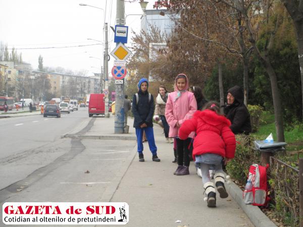 Găsim şi noi în staţia de autobuz din faţa şcolii câţiva elevi din ciclul primar. Sunt din Rovine II (Troaca), cartier craiovean învecinat cu Izvorul Rece. E ora 12.00 şi ei aşteaptă autobuzul numărul 11, singurul care îi poate duce acasă. „La unu fără un sfert pleacă de la staţia din Piaţa Mare. Aşteptăm cam o oră. Ne mai dau voie învăţătorii şi mai stăm prin şcoală, pe hol. Copiii se încălzesc jucându-se“, spune bunica Maria Gijură, cea care astăzi îi însoţeşte şi pe copiii vecinilor spre casă.