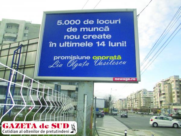 În apropierea blocului S200, inteligenţa trecătorului este provocată brusc de o statistică devastatoare: „5.000 de locuri de muncă create în ultimele 14 luni. Promisiune onorată. Lia Olguţa Vasilescu“. Ca şi hârtia, statistica suportă orice. Informaţiile prezentate sunt greu de verificat, iar cetăţeanul de rând poate înghiţi o reclamă mincinoasă pe nemestecate. Redactorii GdS au solicitat deja primăriei să precizeze câte noi locuri de muncă au fost create în Craiova ca urmare a măsurilor luate de municipalitate, care sunt acele măsuri, în ce domenii au apărut locurile de muncă şi care era rata şomajului la sfârşitul lunii octombrie 2013. Potrivit Agenţiei Judeţene pentru Ocuparea Forţei de Muncă (AJOFM) Dolj, la sfârşitul lunii octombrie 2013, rata şomajului la nivel de judeţ era de 9,03%, corespunzătoare unui număr de 26.500 de şomeri. În septembrie erau înregistraţi 16.000 de şomeri, rata şomajului fiind de 5,47%.
