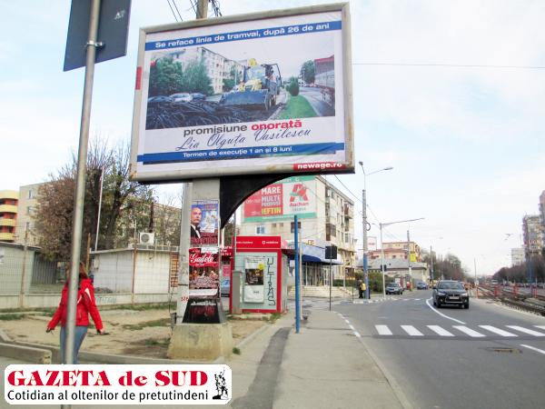 Lia Olguţa Vasilescu a împânzit Craiova cu spoturi publicitare în care se laudă cu realizări care nu-i aparţin. Situaţia a fost deja detaliată de GdS („Oglindă, oglijoară, cine minte cel mai bine din ţară?“ – 8 noiembrie 2013 şi „Reclamă sfruntată“ – 18 noiembrie 2013), motiv pentru care nu vom insista asupra acestui aspect. Reclamele Olguţei Vasilescu sunt afişate pe panourile firmei New Age Advertising SRL, cea mai mare parte situate central, pe bulevardul Calea Bucureşti. Potrivit reprezentanţilor firmei, Olguţa a încheiat un contract de publicitate pe persoană fizică pentru 12-14 panouri stradale, pe o perioadă de 30 de zile. Suma plătită rămâne însă secretă, pe motiv că este un contract comercial cu clauze de confidenţialitate. Este însă aceasta o afacere exclusiv privată, în care printr-o veritabilă dedublare persoana fizică Olguţa Vasilescu nu are nici o tangenţă cu primarul Olguţa Vasilescu? Să vedem care este contextul în care a intervenit contractul.