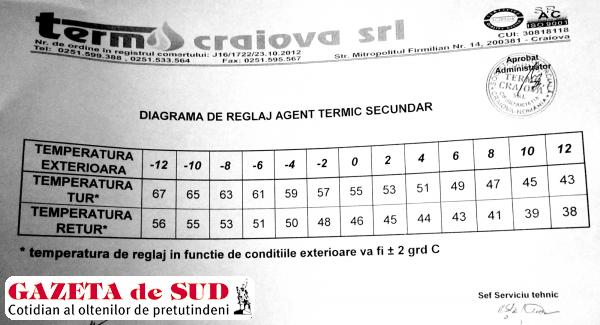 Corelarea temperaturii agentului termic secundar cu cea a temperaturii exterioare se face conform unei diagrame aprobate de către SC Termo Craiova SRL. Spre exemplu, la o temperatură exterioară de 0 grade Celsius, temperatura pe tur trebuie să fie de 55 de grade Celsius, iar cea de pe retur de 46 de grade Celsius. Pe o diagramă de la +12 şi -12 grade Celsius, temperatura pe tur poate creşte de la 43 la 67 de grade Celsius. Potrivit specialiştilor în termodinamică, dacă în PT-urile cu reglare manuală diagrama nu a fost respectată, populaţia a primit mai multă căldură decât avea nevoie. Termo SRL are un dispecerat de unde se transmit parametrii la care trebuie să plece agentul termic din PT-uri. Aşadar, a fost respectată diagrama? Directorul SC Termo SRL, Mihail Neaţu, a refuzat să stea de vorbă cu reporterii GdS, motivând că nu are timp liber. În aceste condiţii, SC Termo SRL ar trebui să pună la dispoziţia asociaţiilor de proprietari istoricul diagramei pe luna decembrie 2013.