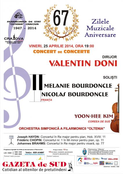 Mâine, 24 aprilie şi vineri, 25 aprilie 2014, sunt prevăzute o serie de evenimente în cadrul Zilelor Muzicale Aniversare (67 de ani de existenţă a Filarmonicii de Stat Oltenia Craiova).
