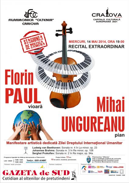 Filarmonica Oltenia va marca Ziua Dreptului Internaţional Umanitar printr-un recitalului extraordinar susţinut de Florin Paul (vioară) şi Mihai Ungureanu (pian). Evenimentul are loc miercuri, 14 mai 2014, ora 19:00, în cadrul Stagiunii de Muzică de cameră a Filarmonicii Oltenia.
