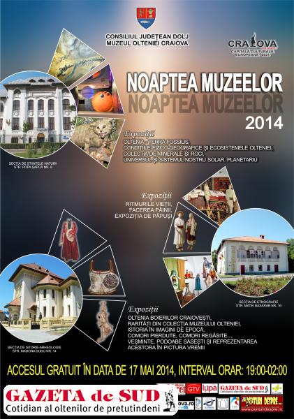 Craiova se încrie astfel, în rândul celor peste 150 de muzee şi organizaţii de cultură şi educaţie din 48 de localităţi din România, ce vor organiza vizite gratuite şi evenimente speciale în cadrul evenimentului “Noaptea Europeană a Muzeelor 2014. Aceeaşi noapte, scenarii diferite”, proiect coordonat de Reţeaua Naţională a Muzeelor din România, ajunsă la a X-a ediţie. Peste 3000 de muzee europene sărbătoresc anual “Noaptea Europeană a Muzeelor”.