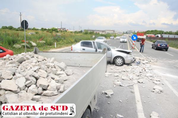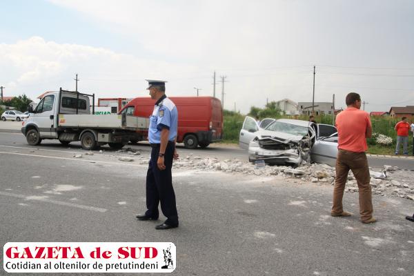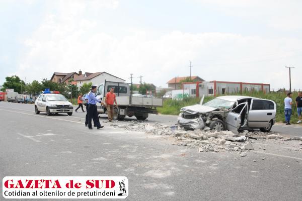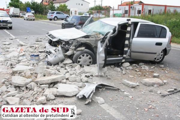 Potrivit polițiștilor doljeni, Laurenţiu Harabagiu, de 41 de ani, din Caracal, în timp ce conducea un Opel Astra pe DN 6, către Craiova, nu a păstrat o distanță de siguranță față de o autoutilitară Iveco încărcată cu bucăți de beton, care circula în fața sa, și a lovit-o în spate.