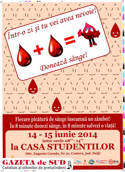 Pe data de 14-15 Iunie 2014, cu ocazia „Zilei Internaţionale a donatorilor de sânge” în Craiova, la Casa Studenţilor se va desfăşura acţiunea de donare de sânge „Fiecare picătură de sânge înseamnă un zâmbet”. Cu această ocazie, toţi donatorii care se vor prezenta la Casa Studenţilor vor avea ocazia să primească şi o carte cu titlu gratuit „Tablete de Stil de viaţă”.