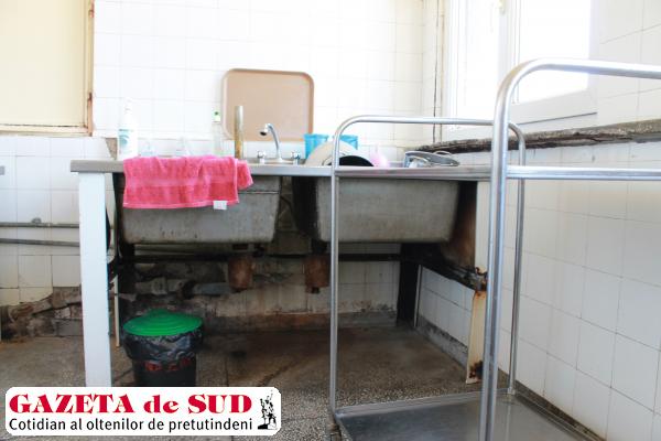 Oficiul alimentar din Clinica Chirurgie II arată ca o bucătărie părăsită. Țevile de sub chiuveta în care sunt spălate vasele din care mănâncă bolnavii au fost roase de rugină. „Acest oficiu alimentar este așa de când s-a dat spitalul în folosință. Ar trebui să fie o hotă care să atragă aburul. De asemenea, trebuie schimbat și mobilierul“, a spus Maria Bitu, asistenta-șefă din Clinica Chirurgie II.