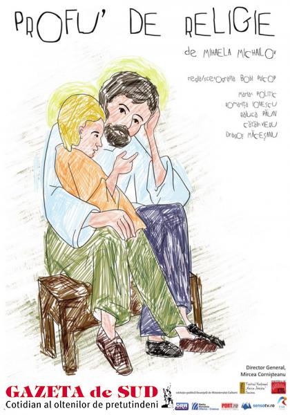 Spectacolul „Profu’ de religie” îi are în distribuţie pe actorii Marian Politic, Dragoş Măceşanu, Romaniţa Ionescu, Cătălin Vieru şi Raluca Păun. Piesa, care abordează o problematică universală, respectiv felul în care adevărul poate fi interpretat și manipulat în diverse feluri, astfel încât sensul său să devină relativ, a fost declarată câştigătoare în cadrul celei de-a III-a ediţii a Concursului de proiecte pentru tineri regizori şi dramaturgi români, organizat de Teatrul Naţional ”Marin Sorescu” din Craiova în anul 2013.