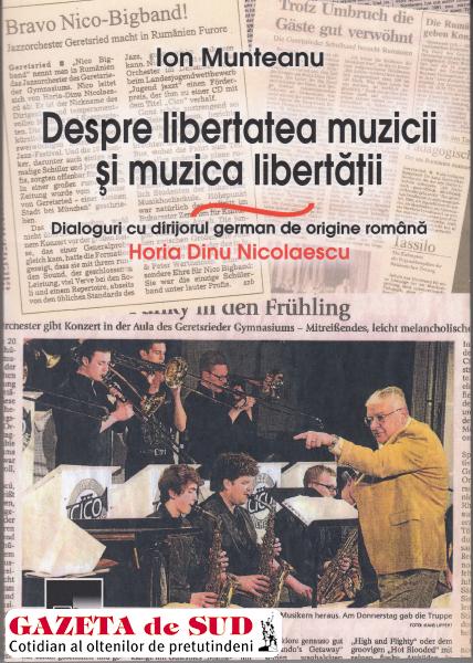 Zilele trecute, la Editura AIUS Craiova, a apărut o carte-document despre muzicianul Horia Dinu Nicolaescu, originar din Craiova, stabilit (din 1971) în Germania, în prezent dirijor al formației „Cico* s Jazz Orchester” din Geretsried, suburbie a orașului Munchen. Coperta: Viorel Pîrligras; editor: Nicolae Marinescu. Autor: scriitorul craiovean Ion Munteanu, autor a zece cărți, din care una a fost premiată de Fililala Craiova a Uniunii Scriitorilor, iar ultima publicată – „La pupitrul vieții… Octav Calleya. Ghid de sociologia muzicii” a fost tradusă în Spania, în 2013, la Editura Fundacion Malaga.