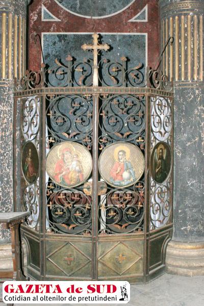 Patru picturi, reprezentându-i pe Sfântul Dumitru, Fecioara Maria cu Pruncul Iisus, Iisus şi Ioan Botezătorul, sunt aşezate de la stânga la dreapta pe uşile din fier forjat ale aşa-zisului altar, „invers decât în bisericile ortodoxe“, după cum ne spune Ion Cosolan, administratorul cimitirului şi arhivist la Primăria Filiaşi. Imaginile sunt impecabile, cu greu ai crede că timpul a trecut peste ele. Deschidem uşile grele şi descoperim în spatele lor o masă de marmură albă, sprijinită pe un picior, tot din marmură. „Pe piciorul mesei este o lipitură cu ceară de albine, ceea ce ne duce cu gândul că aici s-a vrut a fi un altar, căci în bisericile ortodoxe pe piciorul mesei sfântului altar se lipesc oasele unui sfânt sau moaştele“, ne destăinuie Ion Cosolan.