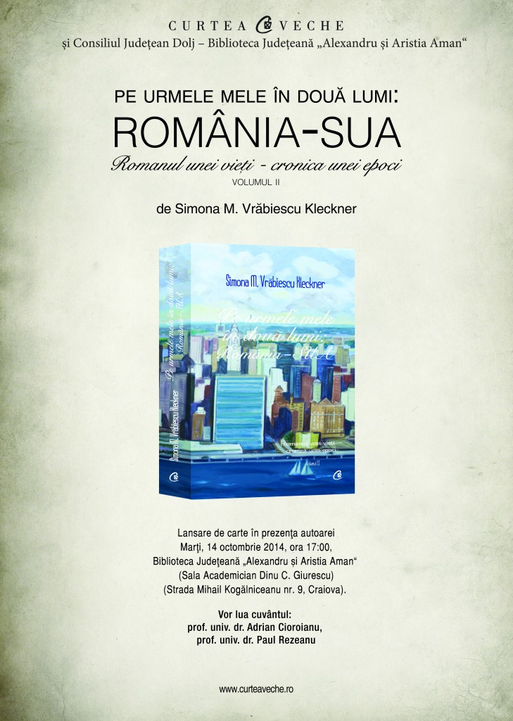 Biblioteca Județeană “Alexandru și Aristia Aman” împreună cu Editura Curtea Veche Publishing găzduieşte marți, 14 octombrie 2014, la ora 17.00, în sala Acad. Dinu C. Giurescu, evenimentul de lansare a cărții „Pe urmele mele în două lumi. Vol. II”, de Simona M. Vrăbiescu Kleckner.