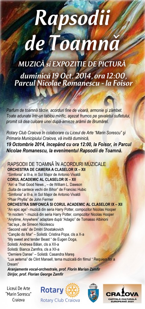 Rotary Club Craiova, Liceul de Arte „Marin Sorescu” din Craiova și Asociația „Craiova Capitală Culturală Europeană 2021” organizează duminică, 19 Octombrie 2014, la ora 12.00, evenimentul cultural “Rapsodii de Toamnă”.