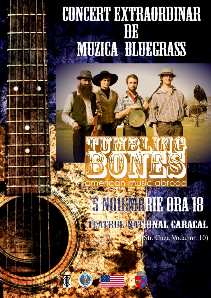 Centrul Cultural Municipal Caracal anunţă concertul extraordinar de muzică bluegrass susţinut de grupul TUMBLING BONES din Statele Unite ale Americii. Evenimentul va avea loc miercuri, 5 noiembrie, la ora 18.00, la Teatrul Naţional din Caracal.