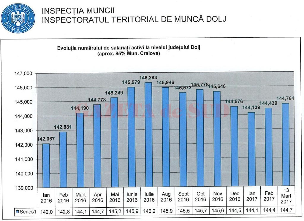 În iarna care s-a încheiat, în Dolj s-a înregistrat cea mai mare scădere a numărului de angajați cu contracte de muncă active din ultimul an supus analizei, adică din ianuarie 2016 și până în ianuarie 2017. Potrivit datelor furnizate de Inspectoratul Teritorial de Muncă (ITM) Dolj, anul trecut au fost fluctuații ale forței de muncă în Dolj. Scăderea constantă a numărului de angajați activi a început din luna noiembrie, când mai erau înregistrați în REVISAL 145.646 de persoane angajate cu acte în județ. În decembrie, numărul angajaților a scăzut la 144.576 de persoane, urmând ca în ianuarie să se înregistreze cel mai scăzut nivel al numărului de salariați, adică 144.139 de persoane, adică un „vârf negativ“ al pieței muncii, cum spun reprezentanții ITM Dolj.