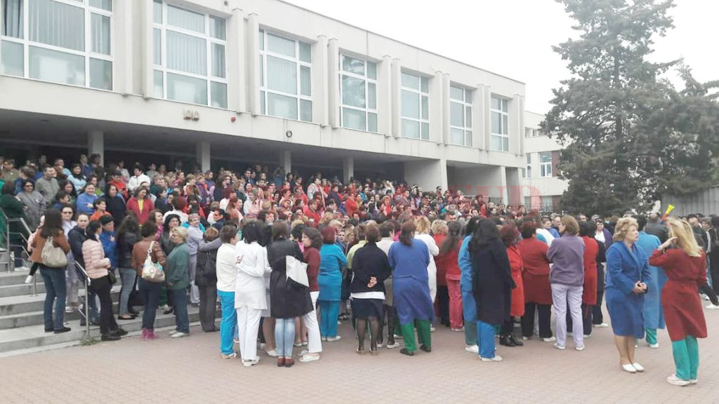 La ora 8.00, curtea spitalului a fost plină de asistente, infirmiere, îngrijitoare și alte categorii de angajați. Peste 700 de oameni au scandat: „Hoți, hoți“, „Grevă generală“. Oamenii sunt nemulțumiți de faptul că în loc să primească o leafă mai mare, așa cum li s-a promis, s-au trezit, de fapt, cu salariile mult diminuate.