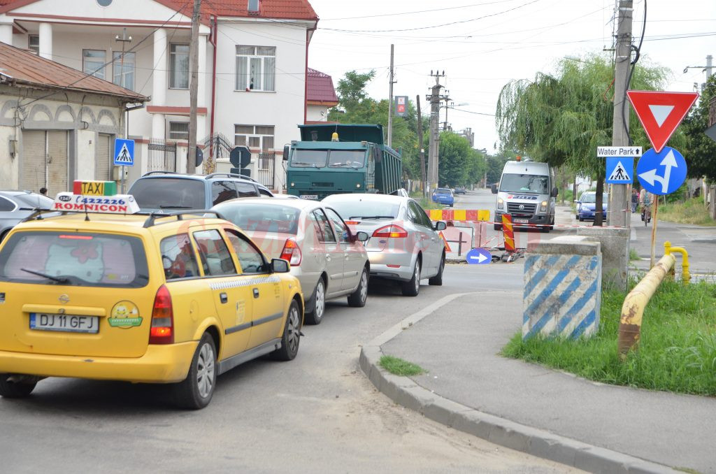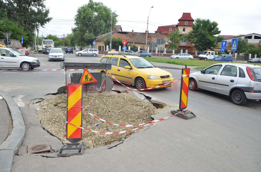 Prăbușirea străzii Bucovăț din Craiova, la intersecția cu bulevardul Râului, este de neoprit. După ce în urmă cu patru zile, asfaltul s-a surpat în apropierea Podului Viorele și în carosabil a apărut o groapă de mari dimensiuni, ieri strada s-a prăbușit din nou. Cu toate că echipele de intervenție de la Compania de Apă au acționat la sfârșitul săptămânii trecute și au astupat craterul ivit în asfalt, strada a crăpat iar. De această dată, groapa apărută în carosabil este mult mai mare. Craterul s-a întins spre bulevardul Râului și trotuarul străzii Bucovăț, afectând sensul de mers dinspre bulevard spre Parcul Tineretului. Șoferii care vin de pe bulevardul Râului și vor să intre pe strada Bucovăț trebuie să aștepte până se eliberează celălalt sens de mers. Minute în șir autovehiculele stau la coadă, iar traficul se blochează frecvent, spre disperarea conducătorilor auto. Totodată, surparea se extinde spre bordurile și trotuarul de pe strada Bucovăț, existând riscul să cadă și un stâlp de susținere a rețelelor CEZ.
