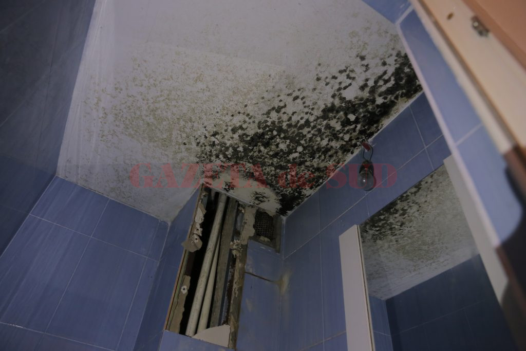 Într-adevăr, în apartamentul Adelei Crețu aerul este de nerespirat, persistă un miros greu de igrasie și mucegai care te sufocă. Peretele și tavanul de la bucătărie sunt îmbibate cu apă și se macină. Baia este distrusă, cu tavanul negru, plin cu pete de mucegai, iar infiltrațiile au degradat până și gresia. Aici nu poți să respiri pentru că te sufoci. Prin deschizătura de aerisire se văd conductele comune din polipropilenă pe care se prelinge apa.