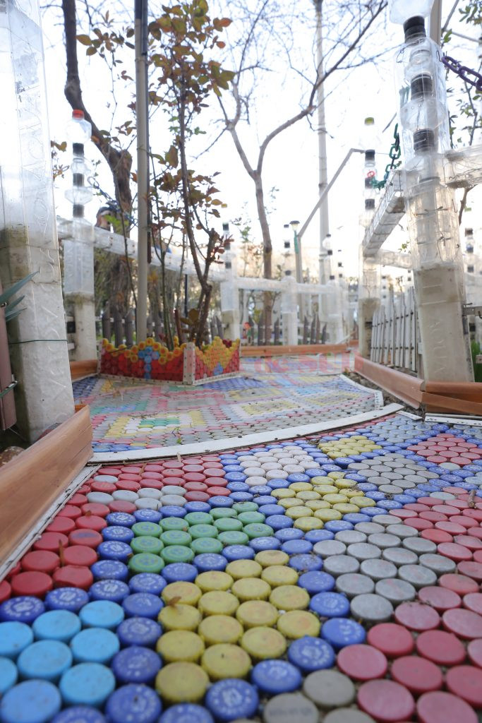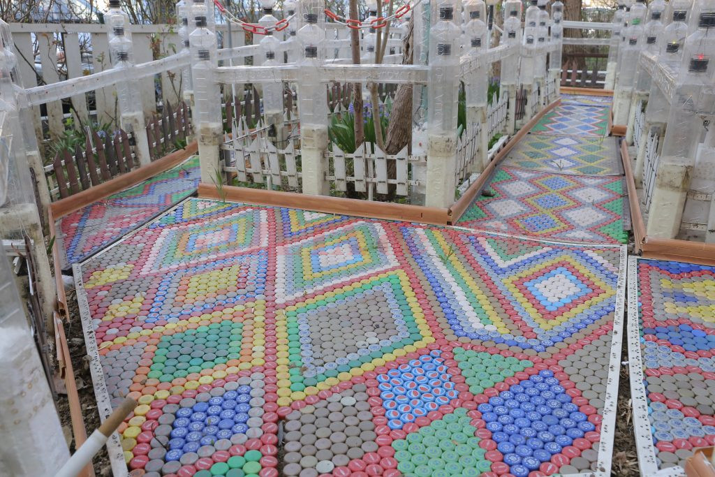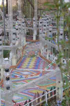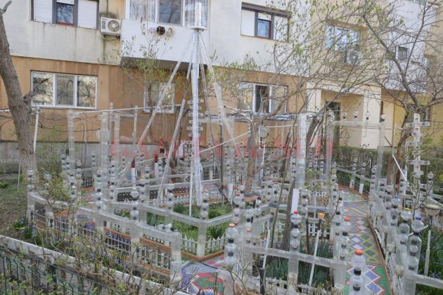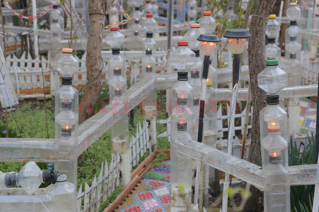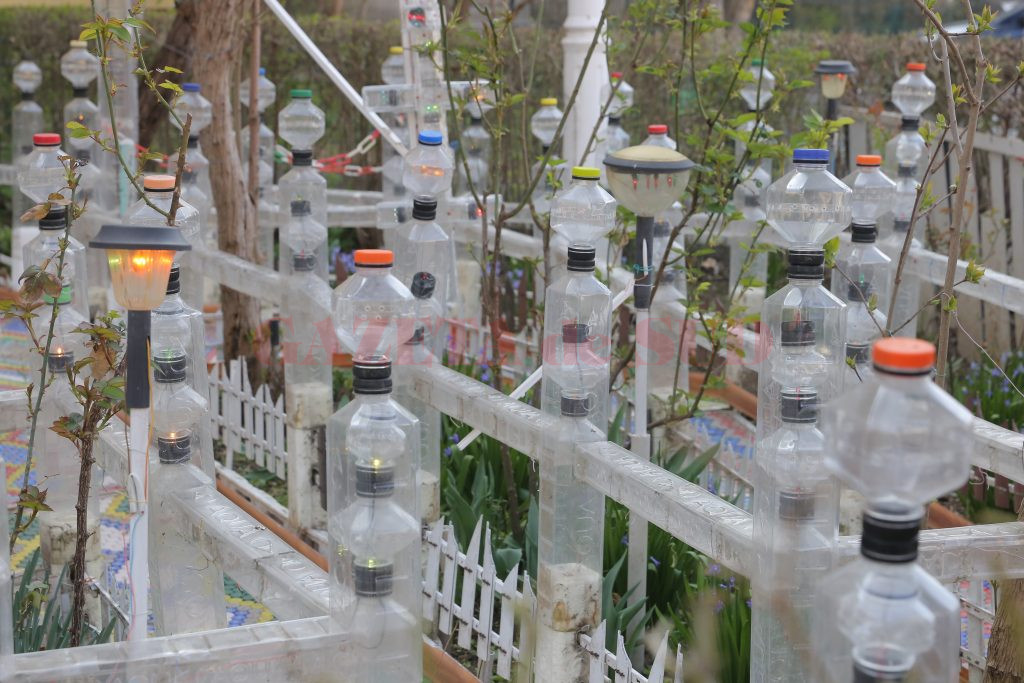 După ce a pavat cu dopuri aproape toată grădina, următorul pas a fost să o şi îngrădească. Tot cu pet-uri. „Pe măsură ce lucram, îmi veneau alte şi alte idei şi aşa am început să o îmbunătăţesc şi să fac şi gărduleţe, şi arcade din pet-uri. Cred că am folosit peste 300 de pet-uri, în care am introdus şi instalaţii de pom. Sunt peste 1.000 de beculeţe în ele“, a adăugat bărbatul.