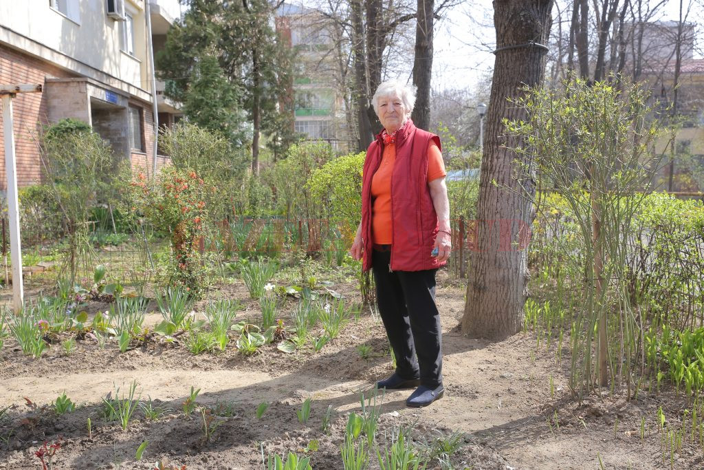 Lângă grădina ei, un alt spaţiu verde înfrumuseţează aleea. Este îngrijit tot de o bătrână. „Sunt prima locatară a acestui bloc, sunt aici de 60 de ani. În tot acest timp nu a ridicat nimeni nici măcar o creangă de pe jos. Singură mă ocup de tot şi cumpăr din pensia mea toate florile pe care le vedeţi. Am cumpărat trandafiri cu 15 lei bucata, am luat bujori de la Bucureşti, am dat 100 de lei cuiva să îmi adune frunzele şi să sape. Nimeni nu a dat nici un leu. Am ghiocei, flori de primăvară, zambile, trandafiri, bujori, primule, tot felul de flori, şi îmi pare rău că nu vine nimeni să mă ajute. Pentru mine, ieşitul în grădină este o relaxare. Regret însă că multe dintre flori se fură. Din acest motiv îmi doresc să ne ajute cineva să îngrădim această grădină cu un gard“, a spus, cu lacrimi în ochi, Florica Nuţă.