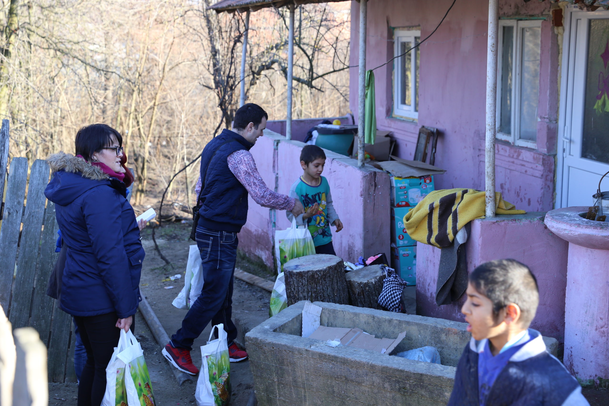 Ultimul popas l-am făcut la o altă casă cu mulţi copii. De după gard ne priveşte o femeie care poartă în spate un băiat de vreo zece ani, cu probleme clare de sănătate. De la ferestre ne privesc ochi miraţi şi speriaţi de copii mărunţei, care rareori văd feţe noi. Apar în prag, după care fac repede cale întoarsă în casă, neîncrezători. Lăsăm darurile în faţa uşii şi îi îndemnăm să se apropie. Abia după ce părăsim curtea, uşa casei se deschide şi, timid, micuţii îşi fac apariţia. Deschid cu mânuţe nesigure plasele şi încep să caute prin ele.
