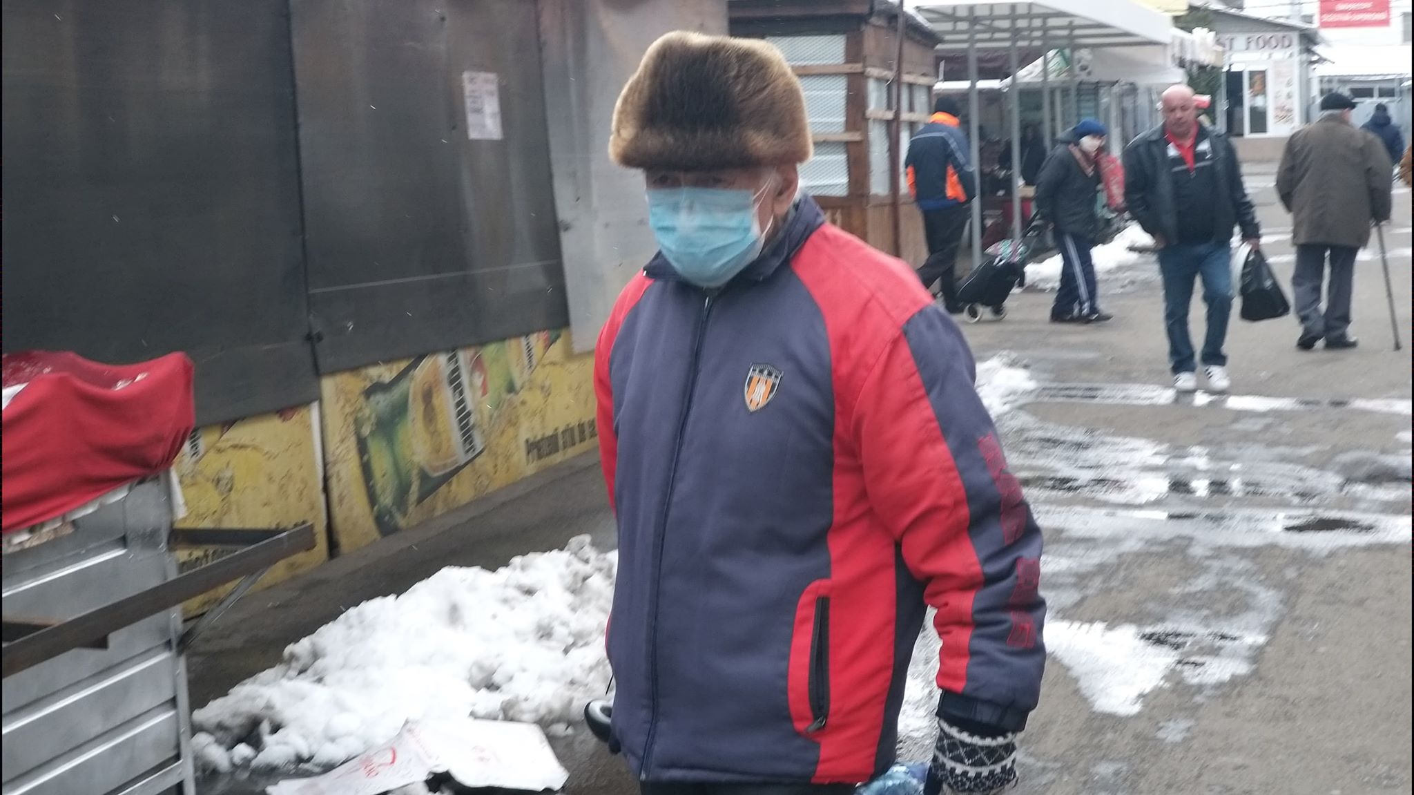 Un bătrân cu părul alb, cu mască de protecţie şi cu o căciulă îndesată până deasupra ochilor trece bombănind.