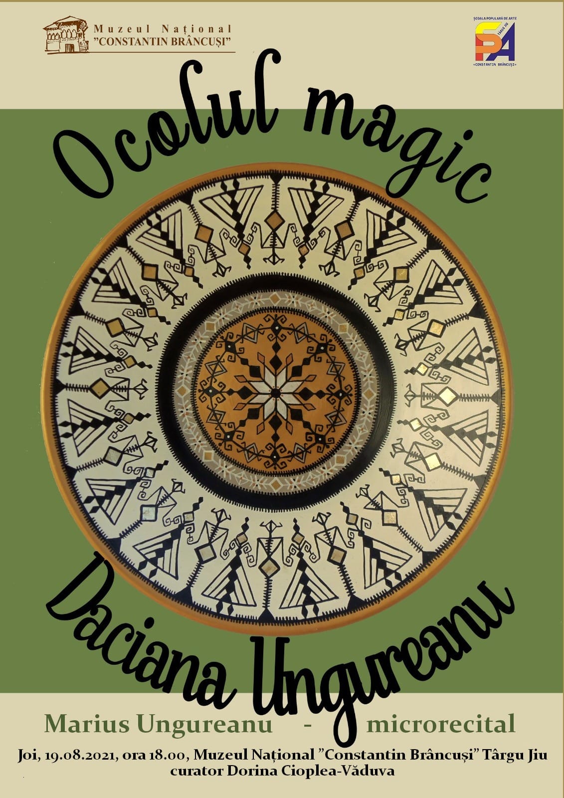 La Muzeul Național „Constantin Brâncuși” din Târgu Jiu are loc joi, 19 august, de la ora 18.00, vernisajul expoziției de artă decorativă „Ocolul magic”, semnată de artista Daciana Ungureanu. Curator: Dorina Cioplea-Văduva. Expune artista Daciana Ungureanu. Aceasta este specializată în pictură pe ceramică.